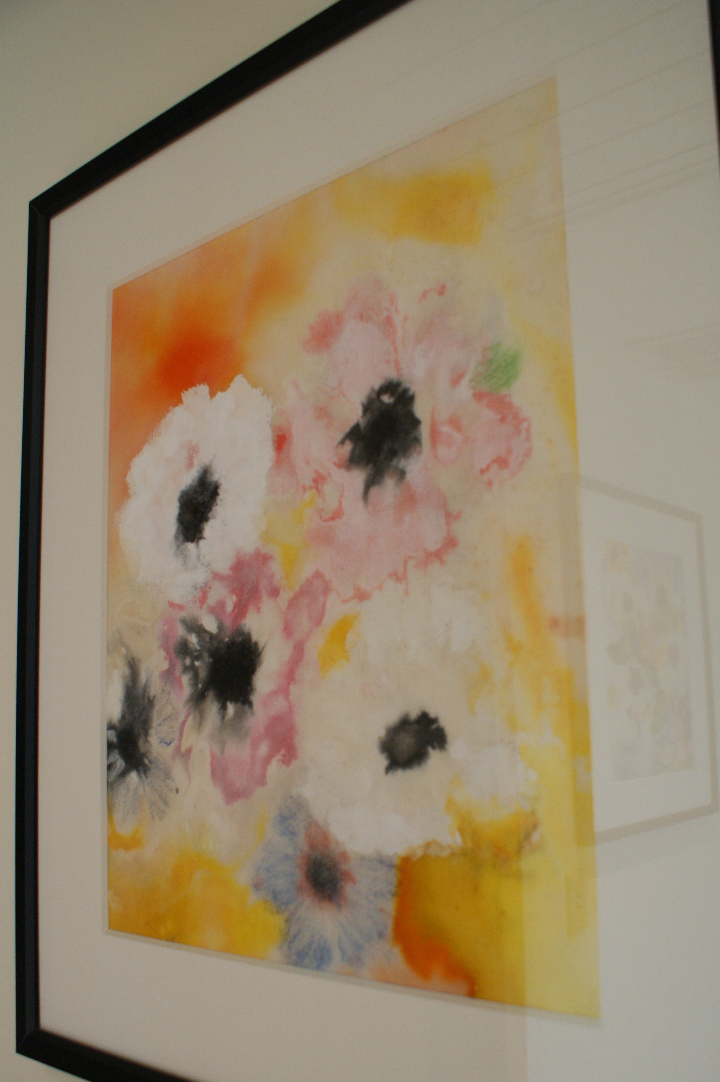 I still have the needlepoint tucked away somewhere, but better yet I now have several of her paintings. A few years ago we were redecorating our upstairs and I decided to have some of them reframed – the faded dark mats and speckled antiqued wood frames were decades out of date and didn’t seem to match the art. At the framers I chose thick white beveled mats and simple black frames, and I asked the framer to remove one painting from the old frame so we could see how it would look when it was finished. It was then that I saw that the previous framers had backed the paintings with brown kraft paper, which, for all these years, had shone through the translucent interfacing and muddied the pigments. When we backed the art with white paper the true colors burst forth.